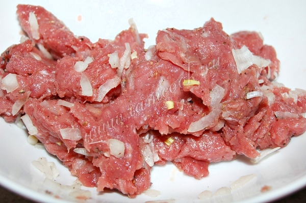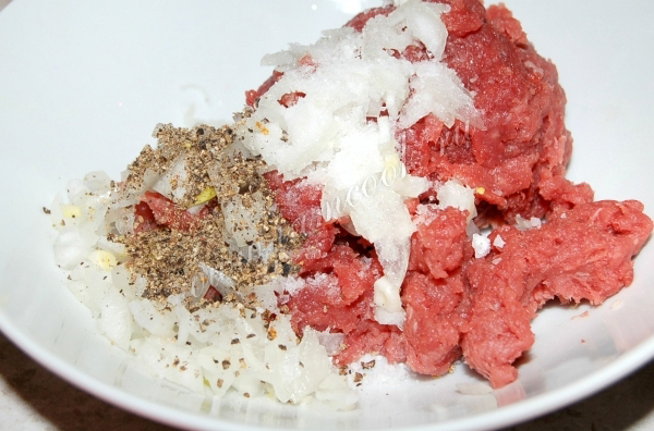 Добавить к фаршу мелко нарезанный репчатый лук, соль, перец, специи.