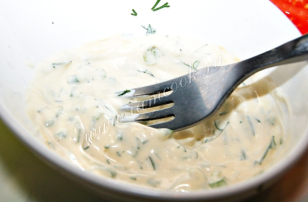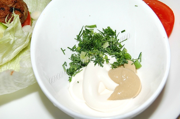 Теперь приготовить соус для закуски. Для этого надо смешать в мисочке майонез, горчицу, зелень, соль и перец.