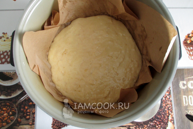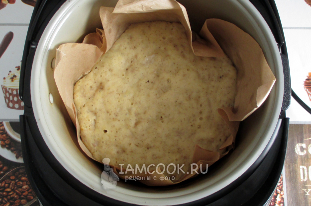 Переложите банановое тесто в смазанную чашу или в форму. Учтите, что тесто поднимется примерно в два раза. Хоть оно и весьма тяжелое, но разрыхлитель да и алкоголь работают по полной, делая тесто пористым, рыхлым и пышным.