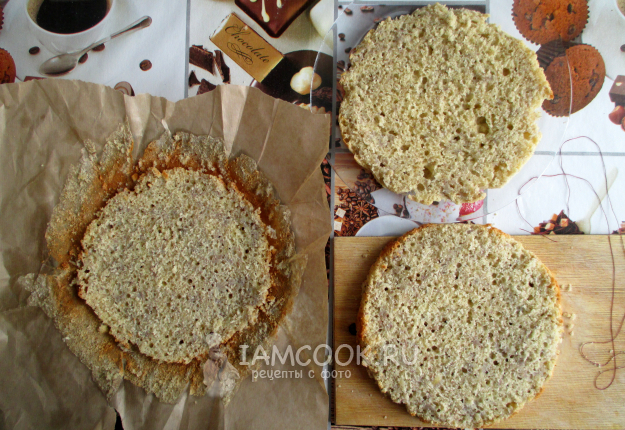Заготовка получилась пышной и пористой, что и видно после разрезания её на три коржа.