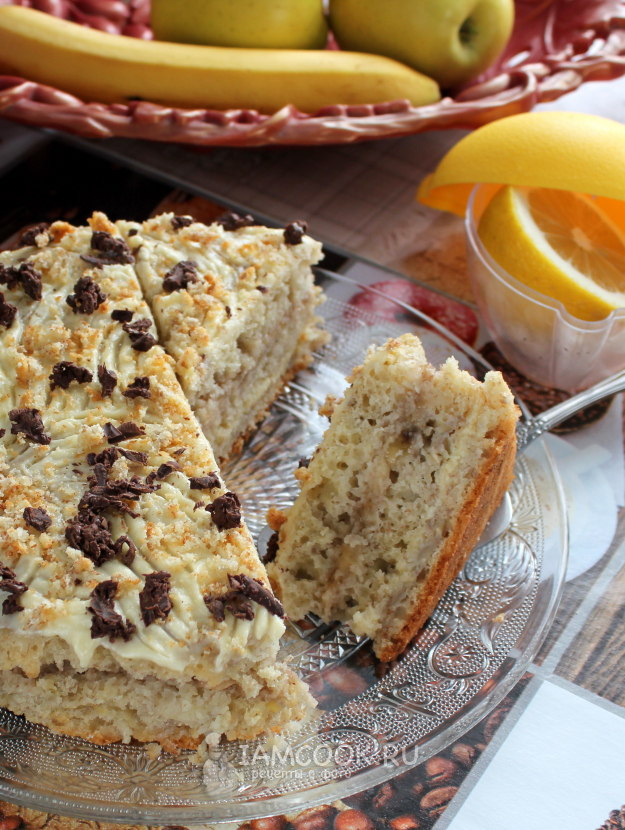 Приготовленный в мультиварке банановый торт нужно охладить, чтобы крем застыл, и можно подавать сразу же или на следующий день. Лимонный сок уменьшает потемнение банана, но все равно слой начинки будет темноватым.