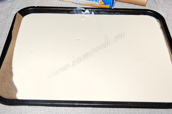 Противень смочить водой, выложить на мокрый противень бумагу для выпечки и вылить тесто, равномерно распределяя по всему противню.