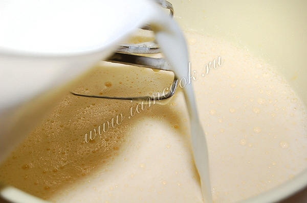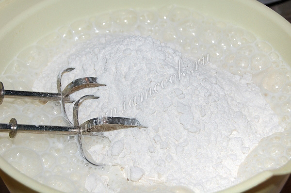 Затем всыпать муку, соль, сахар, растительное масло. Все взбить до однородной гладкой массы.