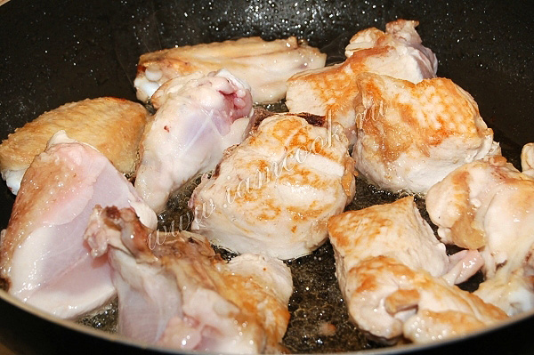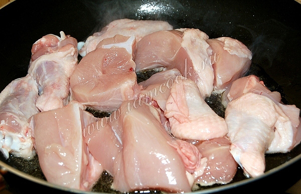 В сковороду налить растительное масло и выложить обжариваться кусочки курицы.