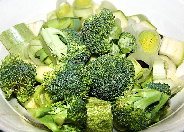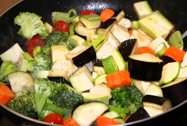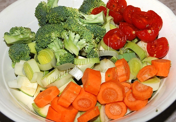 Капусту брокколи разобрать на соцветия и добавить к овощам.