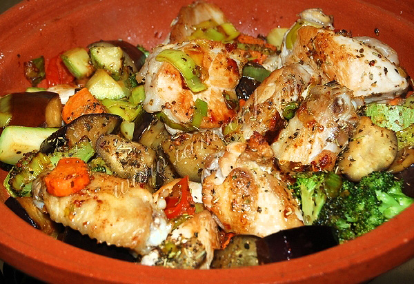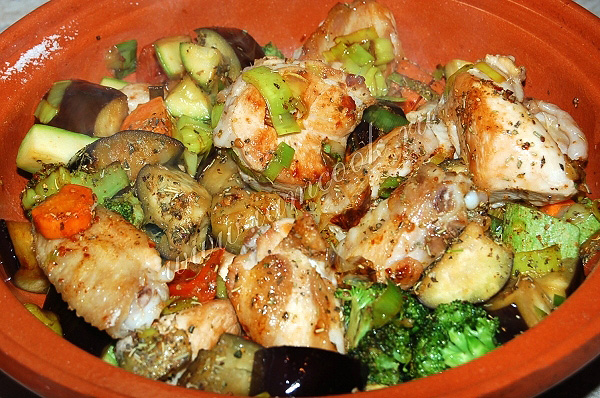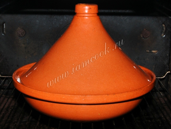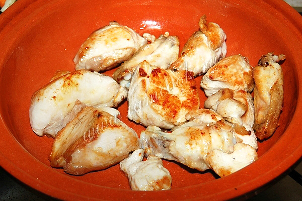 Обжаренные кусочки курицы выложить в латку ( я использовала тажин).