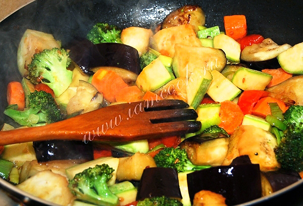 Подготовленные овощи отправить обжариваться в ту же сковороду, в которой обжаривалась курица. По необходимости добавить масло.