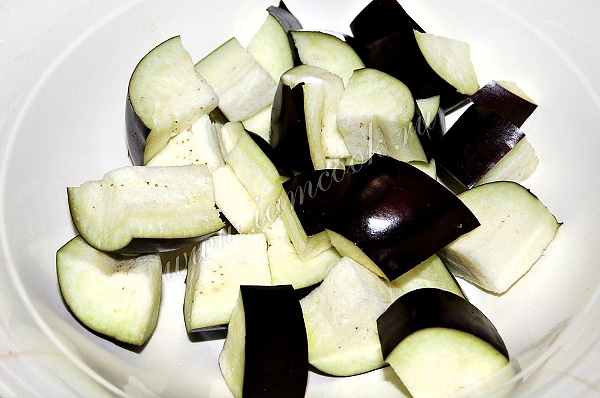 Пока обжаривалась курица, нужно было приготовить овощи. Нарезать баклажан небольшими кусочками. Кожуру не снимать.