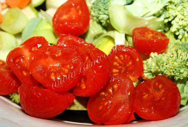 Помидоры черри разрезать на половинки и добавить к овощам.