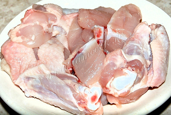 Курицу разрезать на порционные кусочки, помыть и слегка обсушить с помощью салфетки.