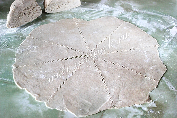 Разделите тесто на 3 части и каждую раскатывайте в тонкий круг. Разделите его на 8 частей.