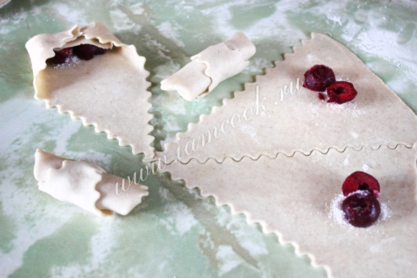 На широкий край каждой части уложите вишню, разрезанную пополам, посыпьте её сахаром. Подверните края теста с боков от вишни и потом скрутите рулетом. Получится рогалик с запечатанной начинкой.