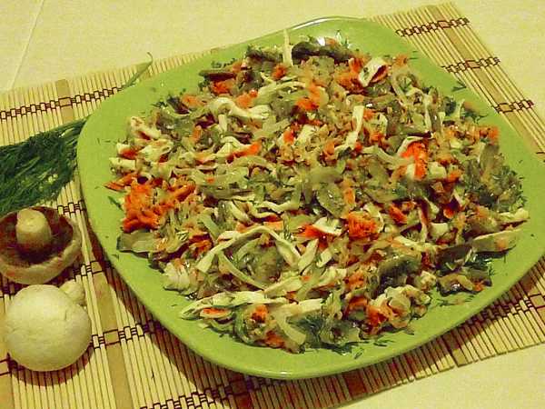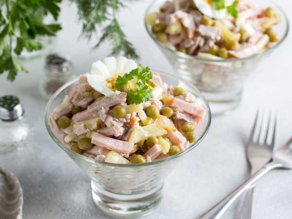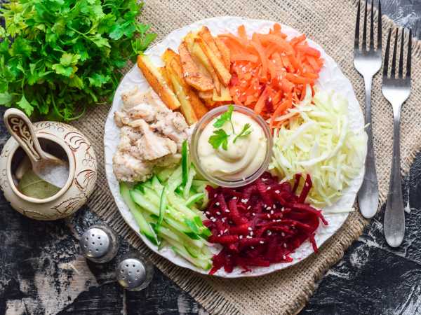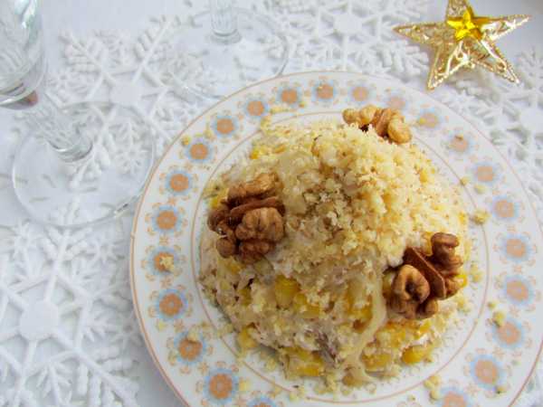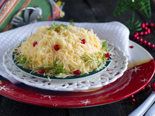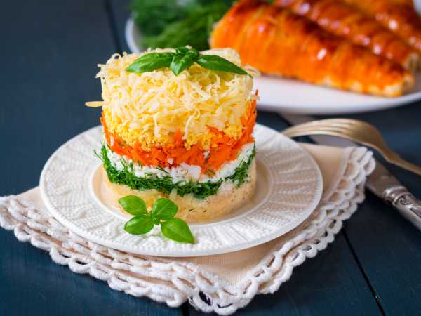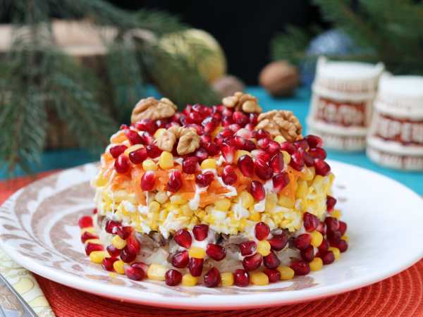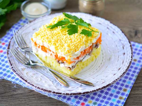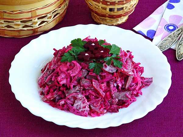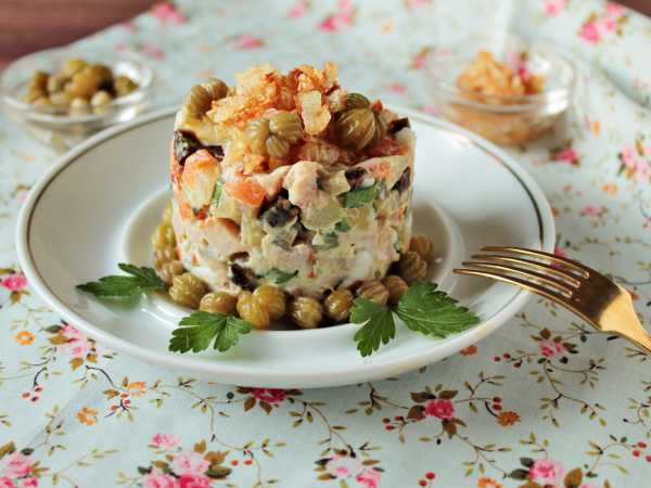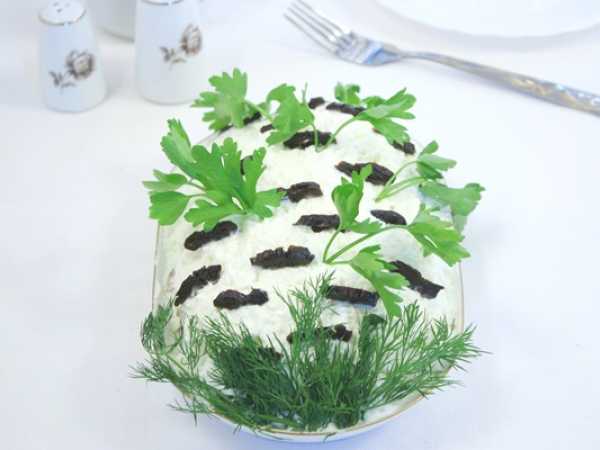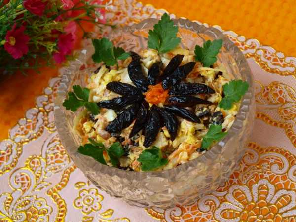 Выложить салат в салатник. Украсить черносливом и листочками петрушки.