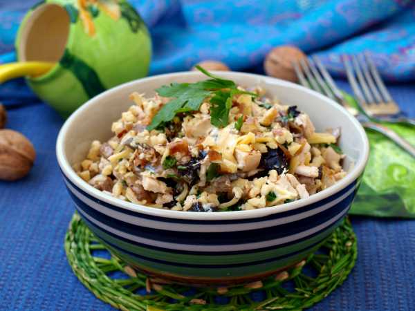 Мне всегда нравились салаты с использованием чернослива. Я считаю что само его присутствие в салатах это уже некая изысканность. Предлагаю вашему вниманию один из самых простых, но очень вкусных салатов, где отлично сочетается чернослив с копченой курицей. Курицу в этом салате можно использовать как отварную, так и копчёную. Вкус у салатов конечно будет разным, но в любом случае он получится вкусным.
