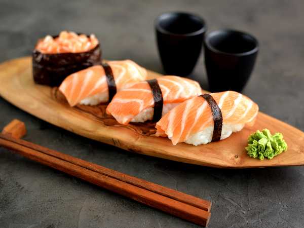 Для приготовления суши нигири и гунканов с лососем подготовьте продукты по списку. Свежайшего лосося просушите бумажным полотенцем, срежьте ребра и кожу, удалите косточки по спинке вдоль филе.