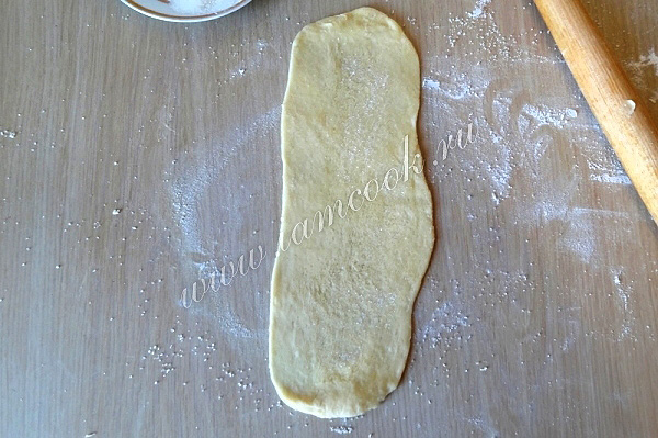 8. Теперь будем скручивать булочки-"завитки". Для этого разделите вторую порцию теста на равные части- колобки (ориентируйтесь по желаемому размеру плюшек). Раскатайте один колобок в продолговатый пласт толщиной 7 мм. Присыпьте сахаром и еще раз пройдитесь скалкой, чтобы сахар вдавился в тесто.