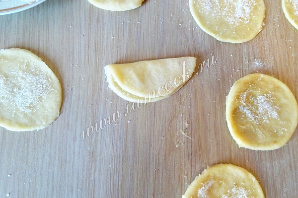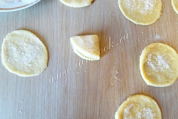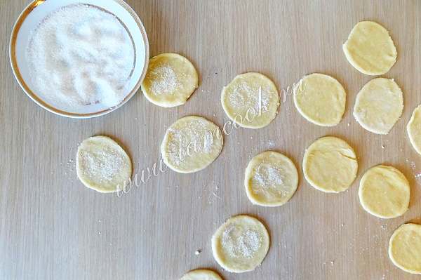 2. Итак, начнем с небольших булочек-"капкейков". Получаются на вид очень интересными и выпекаются в формочках для кексов или маффинов. Раскатайте порцию теста в пласт толщиной 5-7 мм и вырежьте стаканом или формой круги. Смешайте сахар и ванилин. Посыпьте кружочки сахаром, немного придавив его в тесто. Кстати, вместо сахара можно использовать шоколад или повидло.