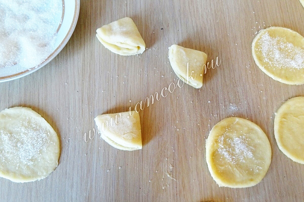 6. Поместите уголки в формочку и немного присыпьте сахаром. Сильно плотно укладывать не нужно.