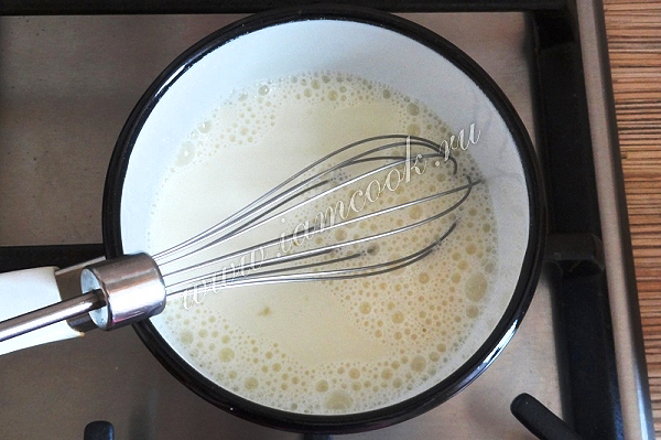 5. Влить тонкой струйкой молочно-крахмальную смесь в подогретое молоко, тщательно при этом размешивать, чтобы яйцо не свернулось.