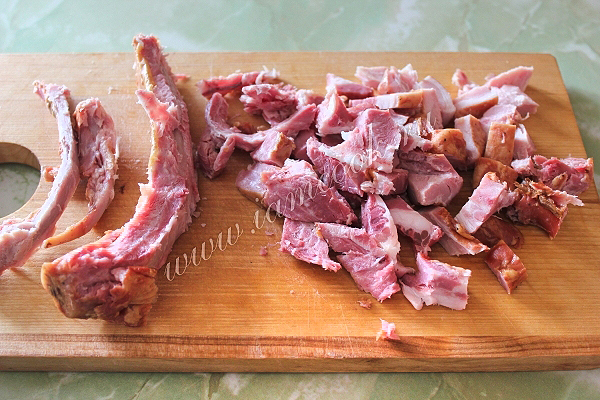 Отделите копченое мясо от костей и добавьте в кастрюлю к гороху, я использовала свиные копченые ребрышки.
