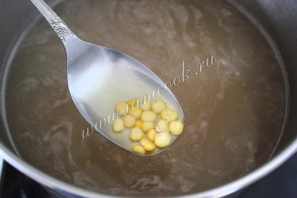 Воду в кастрюле доведите до кипения и забросьте горох, варите его до готовности. Лично мне горох в супе нравится в сильно разваренном состоянии, вы же можете ориентироваться на собственные предпочтения.