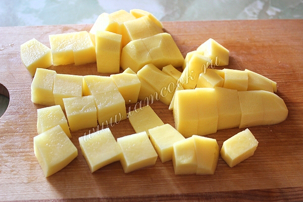 Примерно через 30 минут, после того, как мы закинули горох, можно добавлять следующий ингредиент. Итак, картофель порежьте крупными кубиками и закиньте в кастрюлю.
