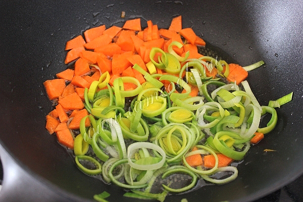Затем порежьте морковь произвольными кусочками, а также лук-порей, колечками и слегка обжарьте овощи на растительном масле. Эти овощи мы добавим в кастрюлю с супом примерно через 5-10 минут после картофеля.