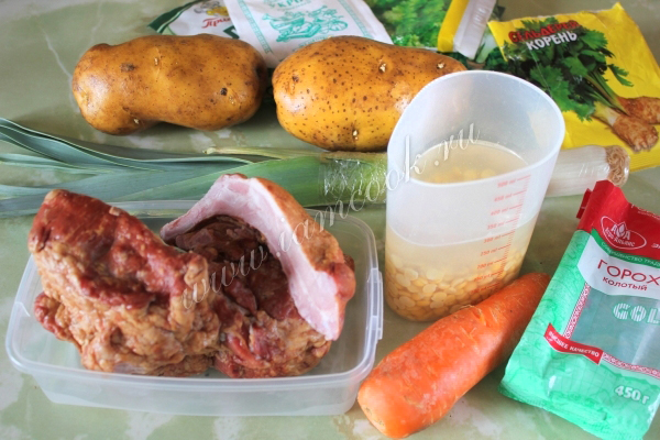 Подготовьте основные ингредиенты для горохового супа с копчеными свиными ребрышками и овощами. Горох предварительно замочите. Также нам понадобятся лук-порей, свежая морковь, картофель, копчености и приправы по вкусу.