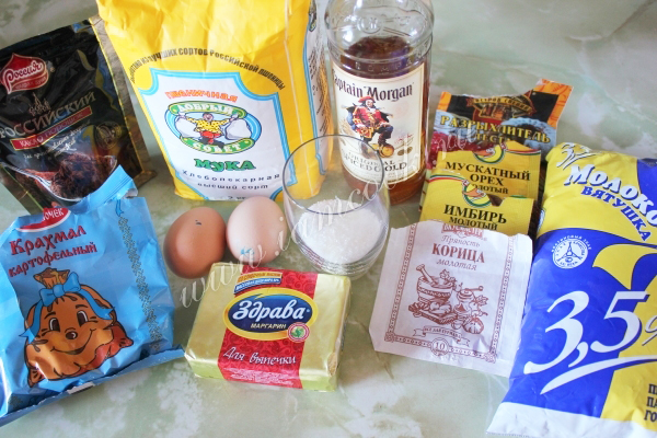 Подготовьте для теста: яйца, сахар, муку, крахмал, маргарин, пряности, соль, молоко, какао, ром и разрыхлитель.