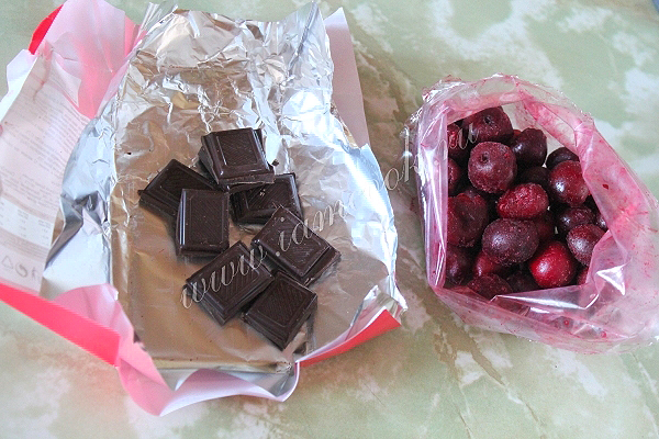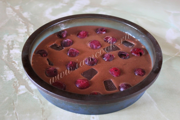 Перелейте тесто в форму, заглубите в него вишни и кусочки шоколада.