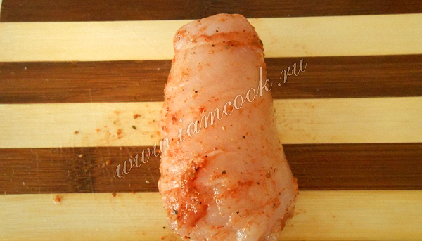 6. Свернуть куриную грудку с начинкой рулетиком.
