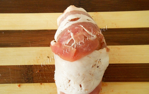 7. Сверху обернуть каждый рулетик ломтиком бекона.