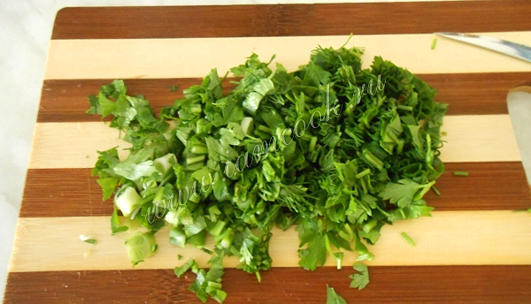 2. Зелень мелко порубить (можно разнообразить, добавив кинзу, укроп, зеленый лук и др.).