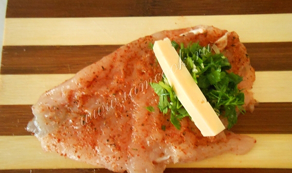 5. На кусок куриной грудки выложить сыр, зелень и чеснок. Не солить!