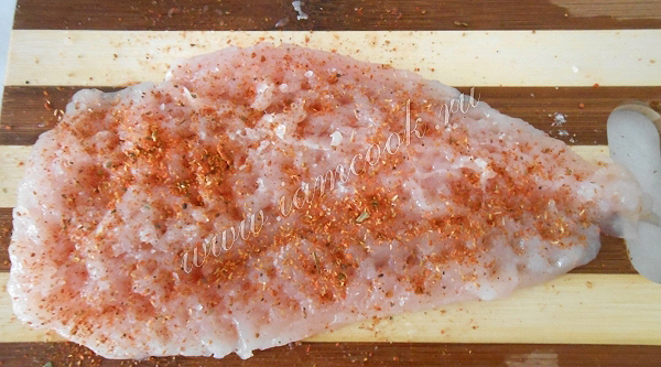 1. Каждую куриную грудку разрезать на две части, отбить, посолить, присыпать специями.