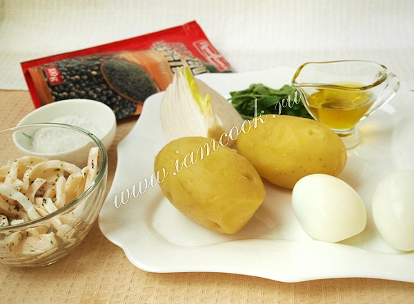 Для приготовления салата нам понадобятся консервированные кальмары, картофель, яйца, репчатый лук, петрушка, оливковое масло, чёрный перец и соль.