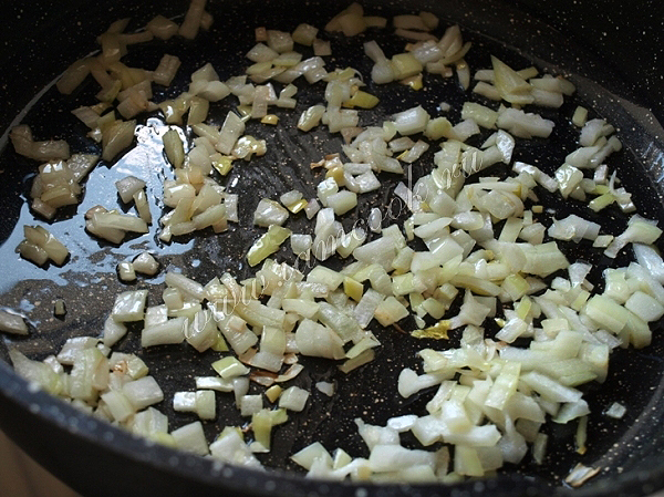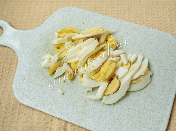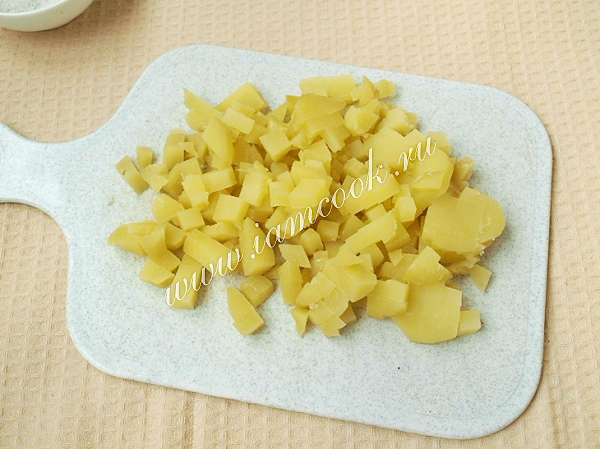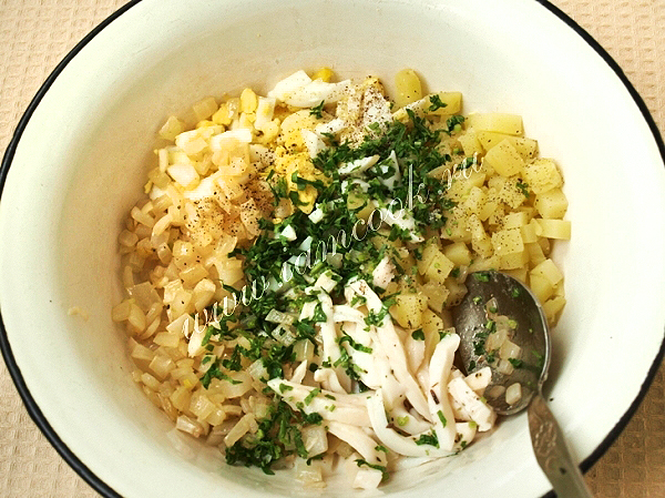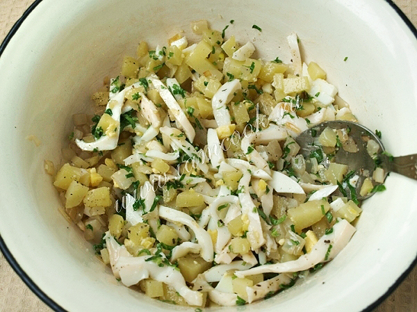 Смешиваем в миске картофель, кальмары, яйца, обжаренный лук и мелко нарезанную петрушку. Солим и перчим по вкусу. Добавляем оливковое масло.