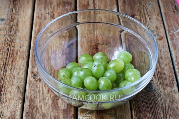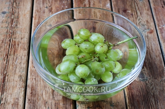 Виноград хорошо помойте сперва в миске, а потом под проточной водой. Выложите его в дуршлаг, чтобы лишняя вода сбежала.