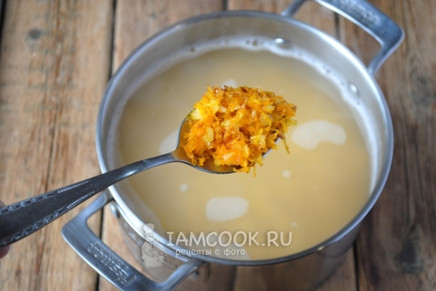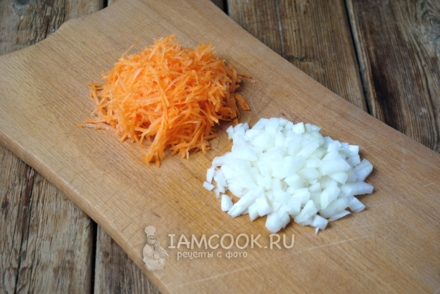 Пока горох варится, очистите и помойте овощи. Лук нарежьте кубиками, морковь натрите на терке.