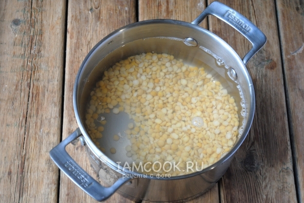 Горох хорошо промойте холодной водой и замочите на 1 час. Затем воду слейте, горох переложите в подходящую по объему кастрюлю и залейте чистой водой. Отправьте на огонь и доведите до кипения. На поверхности образуется много пены, уберите её шумовкой или ложкой. Варите горох на медленном огне до мягкости, около 50 минут, время будет зависеть от сорта и качества продукта.