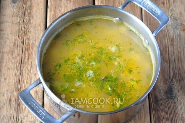 Через 5 минут в кастрюлю отправьте лавровый лист и мелко нарезанный укроп. Проварите 1-2 минуты и снимите кастрюлю с огня.