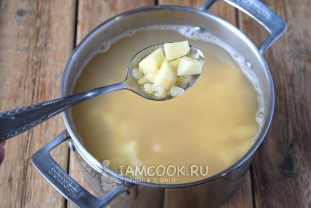 В кастрюлю с горохом отправьте картофель и варите до его готовности, примерно 10-15 минут. Посолите и поперчите по вкусу.