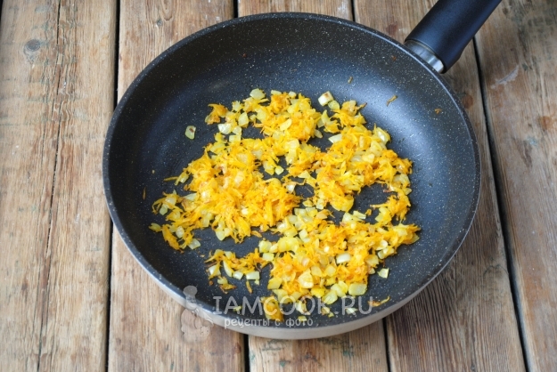 Лук с морковкой обжарьте на растительном масле до золотистого цвета, периодически помешивая.