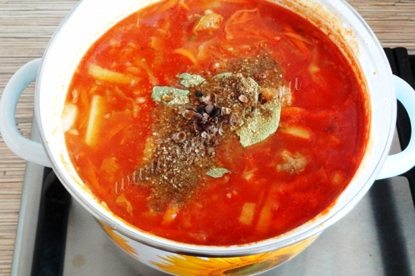 13. Хорошо перемешиваем, доводим до кипения на среднем огне. Добавляем лавровый лист, размолотый душистый перец и специи для борща. Специи я беру на развес на рынке, но иногда заменяю их специями для фарша.