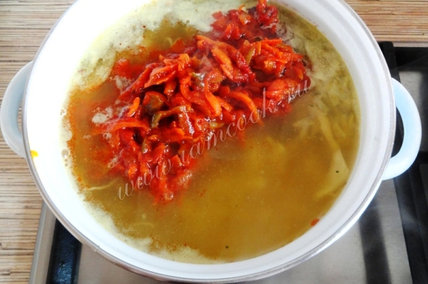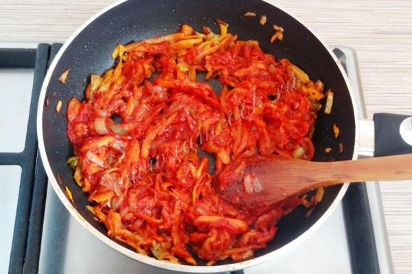 8. Хорошо перемешиваем и немного обжариваем овощи. Наша зажарка готова.