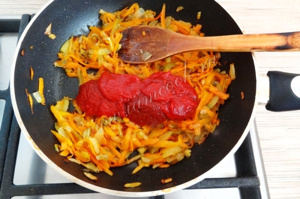 7. Затем добавляем 2 щедрые столовые ложки томатной пасты.