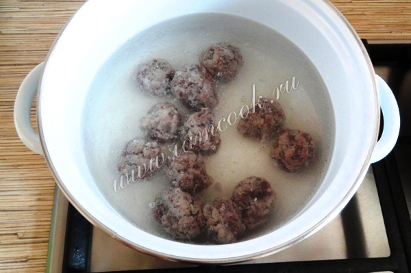9. В кастрюлю наливаем 2 литра воды, немного солим и доводим до кипения. Опускаем фрикадельки.