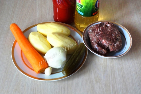 1. Необходимые продукты: мясной фарш ( у меня смесь говядины и свинины 1:1 вместе со специями, луком и чесноком), картофель, морковь, капуста, лук, чеснок, зелень рубленая, маринованный огурец, томатная паста (если есть соленые или свежие помидоры, то ее можно ими заменить), подсолнечное масло, лавровый лист, душистый перец и смесь специй для борща.