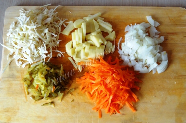 3. Овощи помыть, почистить. Картофель режем средней соломкой, лук рубим кубиками средней величины, шинкуем капусту. На крупной терке натереть морковь и огурец. На мелкой терке трем чеснок.