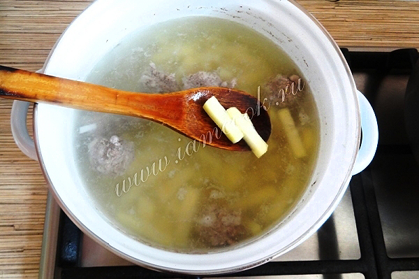 10. Когда вода с фрикадельками закипит, добавляем картофель. Посолить по вкусу.